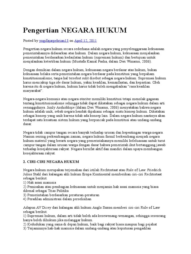 Ciri negara hukum, yaitu adanya supremasi hukum (supremacy of law) dalam arti tidak boleh ada .